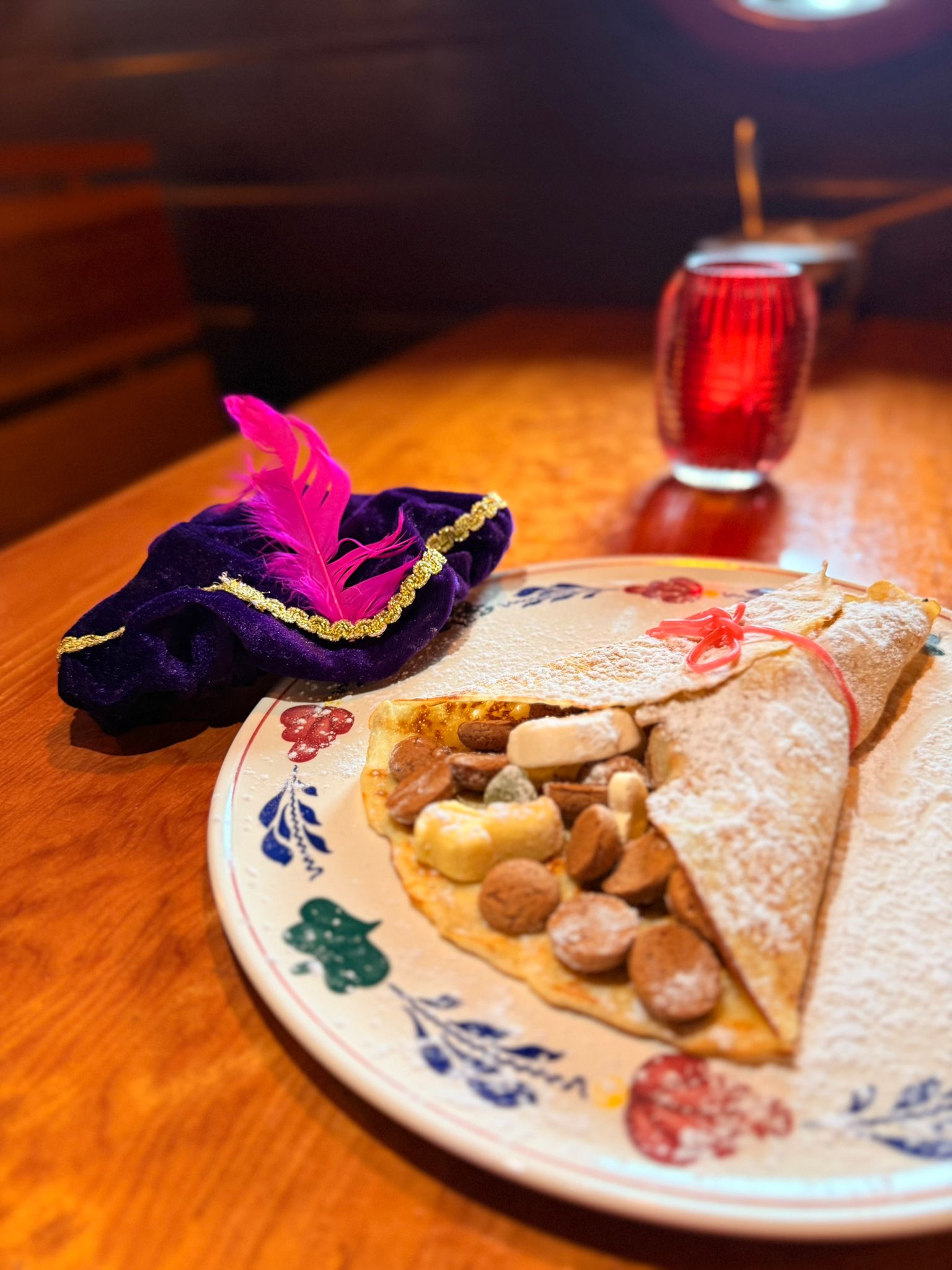 Een heerlijke pannenkoek gevuld met pepernoten en snoep. Ook krijg je nog een leuke pietenmuts!